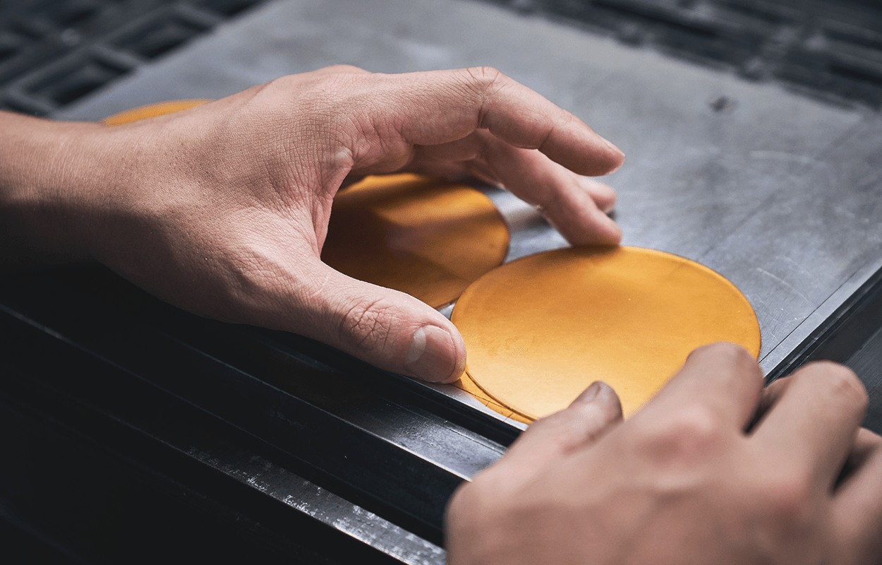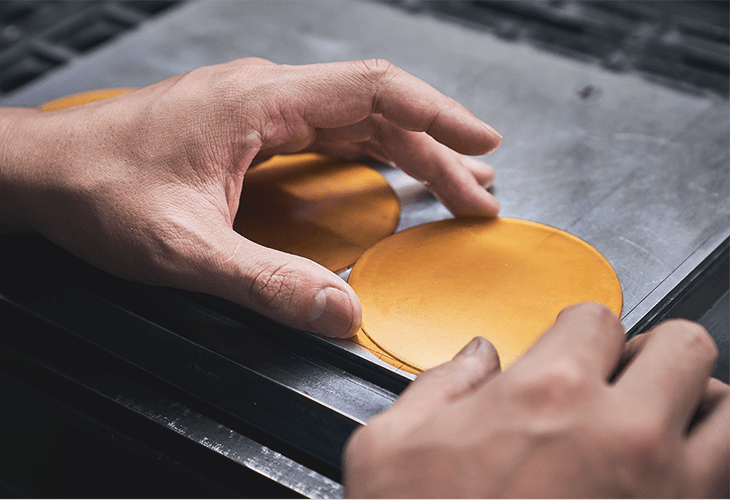 コースターのラインナップに直径100mmの丸型コースターを追加、丸型は最少75mmから最大100mmまでご提供しております。